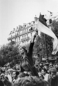 Caroline cuenta que ese día, específicamente el 13 de mayo de 1968, en la plaza Edmond Rostand, cerca del Jardín de Luxemburgo se sintió cansada y le dolían los pies de tanto caminar, por lo que le pidió a uno de sus amigos, el artista plástico Jean-Jacqus Lebel, que la subiera a sus hombros. Otro joven le pasó una bandera del Frente para la Liberación de Vietnam del Sur para que ella la hiciera ondear.