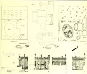 • Fachada del jardín: Dotado de una gran tribuna, el frente orientado al jardín es el que presenta un juego de volúmenes más acusado.