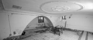 Los esgrafiados y murales con motivos vegetales y aves en paredes y techo fueron limpiados, recuperando detalles originales como nervaduras y degradados de color. También se restauró el techo entrevigado, solucionando problemas estructurales y recuperando su estado original.