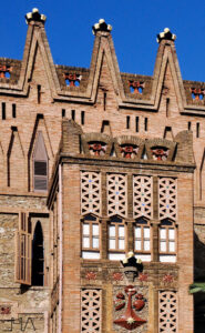 Uso del Material: Gaudí utilizó materiales comunes como el ladrillo, pero los empleó de una manera innovadora. En la fachada principal, la estructura se mezcla con detalles decorativos en piedra y un uso notable de trencadís (mosaicos de cerámica rotos) en las superficies. Esto da una sensación tanto de solidez como de fluidez estética.
