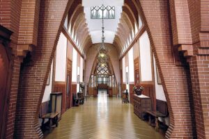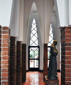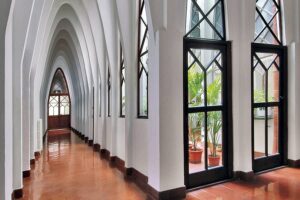 Interior del Colegio: El interior sigue una clara división entre espacios religiosos y educativos, destacando por una clara simplicidad en cuanto a funcionalidad y decorado. Las columnas y arcos son elementos arquitectónicos comunes, pero con detalles que refuerzan la estética modernista y la espiritualidad del lugar. El jardín central está rodeado por un corredor cubierto, proporcionando acceso a las habitaciones y aulas.