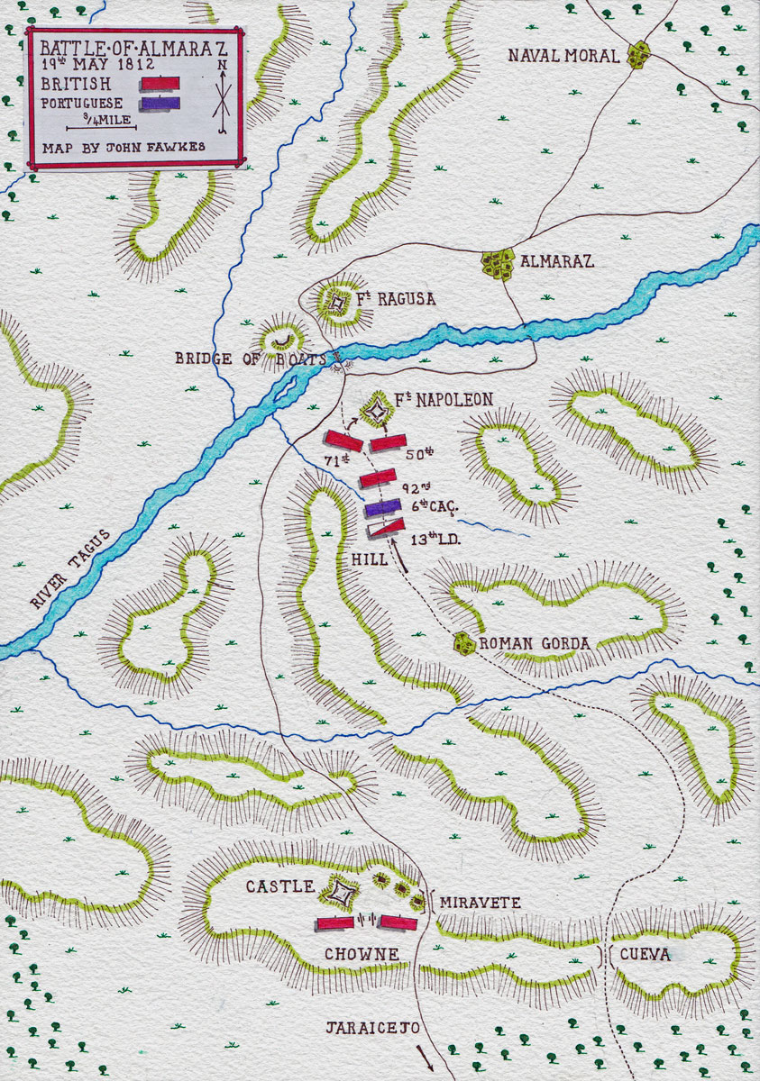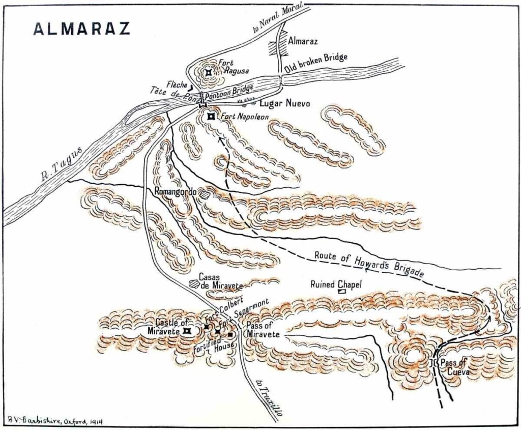 Mientras Drouet de Erlon y Hill se observaban mutuamente, este último dio, con éxito, un golpe de mano contra Almaraz. Era el único paso del Tajo en esta zona y mi comunicación más directa con el ejército de Portugal. El puente de barcas que se había construido allí estaba protegido por una doble cabeza de puente y por dos fuertes glacis, guarnecidos por un millar de hombres y dieciocho cañones. El ejército de Portugal, encargado de cubrir el Tajo, sólo tenía en este valle a la división Foy, acampada en Talavera, lejos de Almaraz.