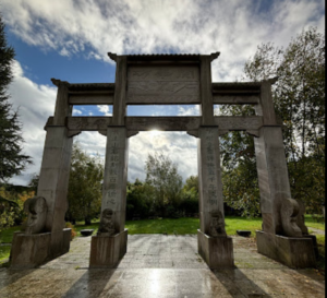 En su interior encontramos un bonito Paifang de piedra, desde sus columnas cuadradas, hasta las vigas, el techo, remates y las 4 esculturas a nivel de planta que lo acompañan. Un paifang simple de tres arcos o vanos, caligrafía china inscrita en sus columnas y elementos que asemejan las tejas.