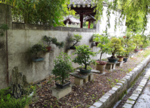 Una colección de pequeños bonsáis, peonias y crisantemos que adornan los jardines.