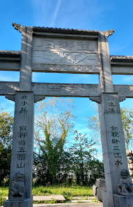 Un pequeño quiosco de piedra similar al del paifang, con inscripciones de color amarillo, columnas cuadradas y un techo acanalado de piedra en forma de canaleta, con remates en las esquinas que parten desde el centro.