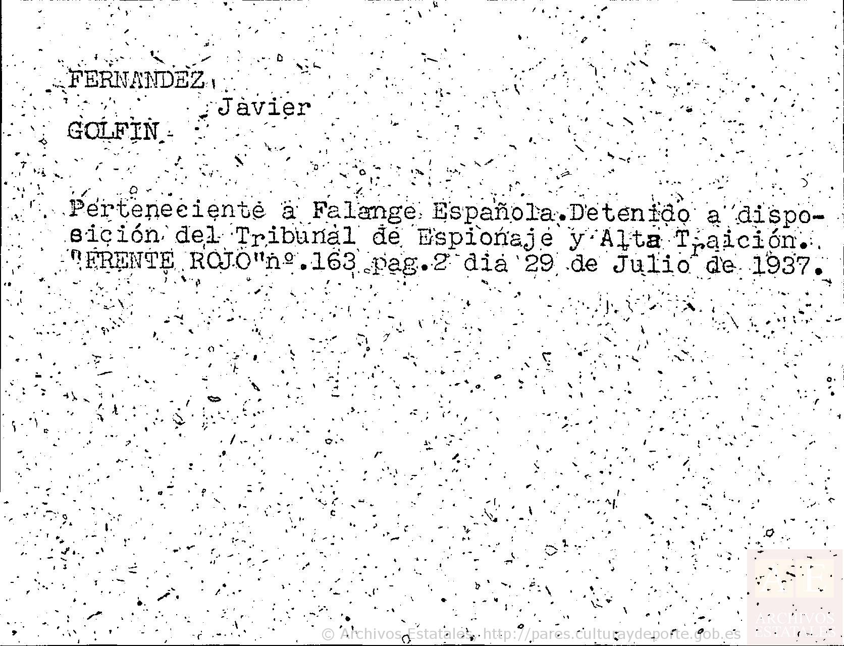 Imagen de: Delegación Nacional de los Servicios Documentales (1937-1977). Ficha de Javier Fernández Golfín. Fichero No. 19 de la Sección Político-Social, Centro Documental de Memoria Histórica (ES.37274.CDMH/4//DNSD-SECRETARÍA,FICHERO,13), Madrid, España
