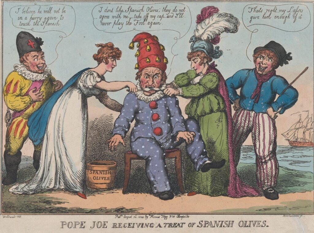 Thomas Rowlandson, Papa José recibiendo un obsequio de aceitunas españolas, Museo Metropolitano de Arte de Manhattan, 1808. Recuperado de: https://www.metmuseum.org/art/collection/search/744110