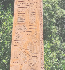 La cultura se presenta con el obelisco y sus jeroglíficos tallados en el.