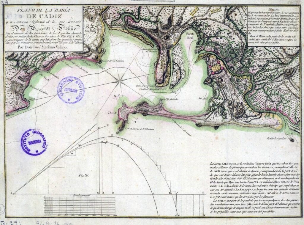 Fundación Legado de las Cortes, Plano de la Bahía de Cádiz en su estado en 1812, Bahía de Cádiz – España, 2017. Recuperado de: https://fundacionlegadodelascortes.wordpress.com/2017/07/11/mortero-villantroix/